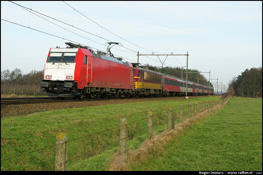 NS HiSpeed 186 122 met NMBS-loc 1182 in opzending als Benelux van Amsterdam naar Brussel. Nispen, 24 januari 2009 © www.railfan.nl