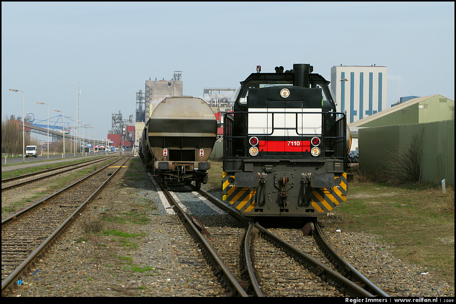 Veolia heeft sinds kort de 7110 ter beschikking en plaatst een aantal graanwagens bij EBS in de Europoort. 26 februari 2009 © www.railfan.nl